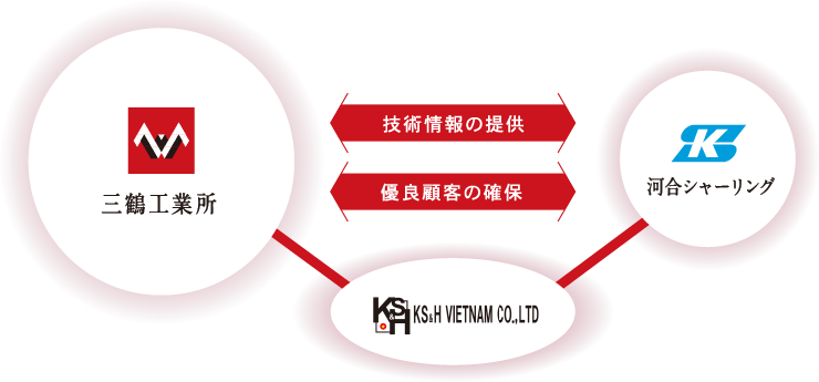 | 関連会社 | 河合シャーリング株式会社 (業務内容 : 一般構造用鋼板/溶接構造用鋼板/酸洗鋼板/縞鋼板/ステンレス鋼板/その他一般鋼材) KS&H VIETNAM CO.,LTD (業務内容 : 設計/CAD製図) |